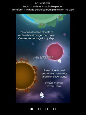 游戏中的飞船和行星各有三项数值,飞船有血量、氧气和燃料,行星有矿石(Ore)、氧气(Oxygen)和燃料(Fuel),飞船只有不断的降落在新的行星上,进行三项资源的补充后,才能继续向远方探索。但光有资源远远不够,我们还需要有神一般的飞行和降落技巧才能完成游戏的终极目标。