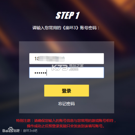 c 在官网用手机号,崩2纯数字账号参加过预登录活动但是还没有进入游戏的,直接在下图页面使用手机号/崩2纯数字账号,密码登录,点击领取奖励即可,游戏开服时直接登录,可以领取到奖励。
