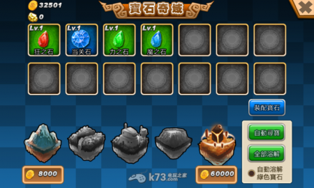 宝石的level依序为绿色、蓝色、紫色和金色4种,宝石获取的层级(颜色)目前推测与个人的等级有关,20等时就算推进到最后一个区域也仅获得蓝色宝石,因此初期没有必要一定要推到60000金币区域,推到20000金币左右获得的宝石就很够用啰!