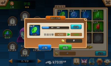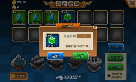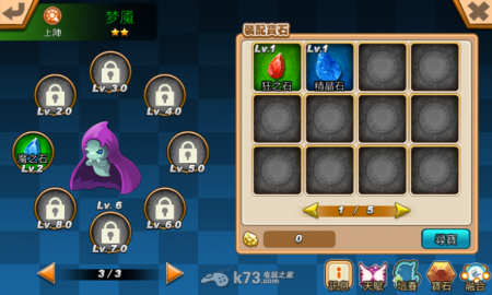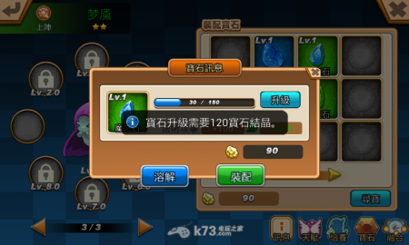 获得宝石后可选择要溶解成宝石结晶,或拾取装备到怪兽身上。可惜的是官方没有设置一键拾取的选项,需要一个个点选稍微有点不方便。而怪兽可装备的宝石数量依怪兽等级开启,每10等开启一个格子。