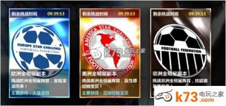 1.限时关卡有三类:欧洲全明星、非洲全明星和美洲全明星。每个关卡又分为初级、中级和高级三个类别。