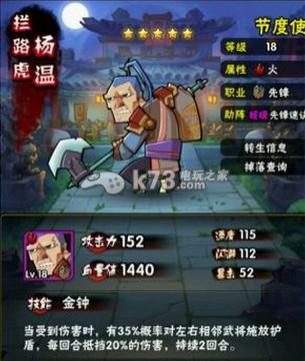技能:金钟-当受到伤害时,有35%概率对左右相邻武将释放护盾,每回合抵挡20%伤害,持续两回合!这也是杨温作为好队友的资本!很好的为队友提供减伤的技能!