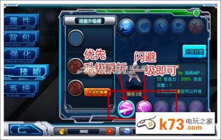 我们的初始角色是剑灵,到10级可以开启三个技能,主要升级第一个技能瞬斩,这是我们前期输出的主要手段。闪避点一级躲避攻击就足够了,等到了以后等级高了再把所有技能升满。