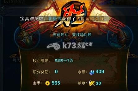 不过,还是比较人性化的,虽然对战一次还是输了,但是系统奖励了很多哦!会有一定数量的金币、粮草和水晶。级别越高获得的奖励数量就越高,排名、积分也会更高!感兴趣的朋友快来尝试一下吧!