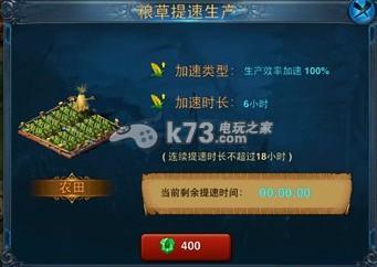 提高农田产量的方法>>>①如果粮草不够用而绿钻充足的条件下,玩家可以通过消耗400绿钻使得粮草生产效率加速100%(持续6个小时,并且连续提速时长不能超过18小时)。②在研究院中消耗一定数量的水晶蓝提升种植术等级(等级越高,升级消耗的水晶越多),等级越高农田产量加成越高。
