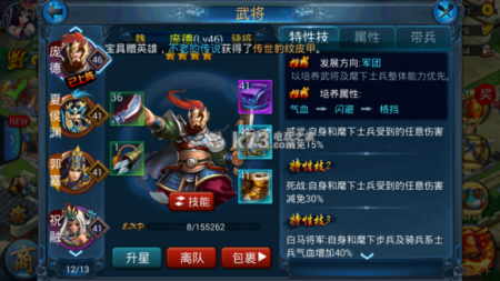 庞德是“军团将”,其士兵的能力非常高,虽然他可以带骑兵,但因为是减伤属性为主,所以建议带领同样具备减伤能力的盾兵以便能够更好的吸收伤害。