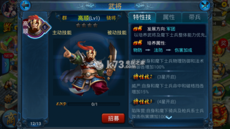 高顺的特色就是全能没有短板,适合在任何位置跟任何兵打,自身双防增加有效避免被后排瞬间秒掉,是个非常好的将领,不过遇到暴力个人输出将则会因为没有闪避格档而被快速灭团。