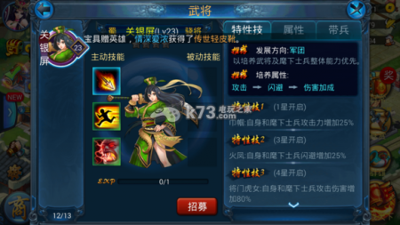 关银屏的3个特性技有防御类的闪避、攻击类的攻击力、攻击伤害,他属于半肉半输出的将领。
