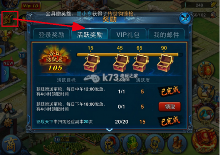 在游戏界面的左上角有一个奖励的图标,玩家们可能较多注意的是登陆奖励,却不知道里面还有一个活跃奖励,下面小编就给大家说说活跃奖励的领取内容和方法吧。