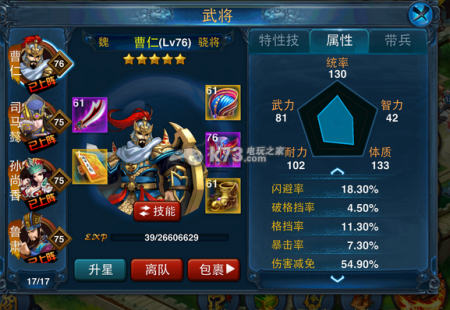 三是作为肉盾常用步兵的曹仁特性技的减免加成及步兵本身的高血量、高防御,下图是我的曹仁的属性数据,76级羽林郎将,血量120多万,双防2000多,伤害减免50%多,格挡、闪避10%以上,战斗效果是曹仁在17章之前不放一个免伤技能直接打完;