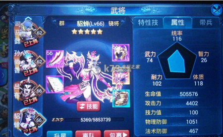 除了香香3星, 其他5个 都是5星。 当然 你要没几个5星 带几个66和62武将推到16章会吐血。 至少我到15章为止很轻松 属性不算特别好 随意炼化的 看属性可以看到。