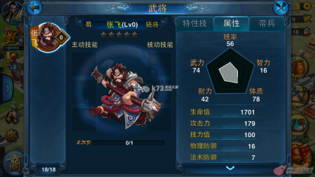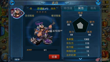 张飞的主属性,武力和体质分别是74和78,而许诸则为50和46,这也就是橙卡的优点了,除了特技要比紫卡好,其实成长也是要比紫卡好很多的。