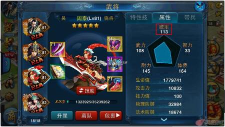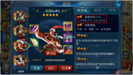 比如例子中的周泰,他的发展方向自然很明了是个人武将,而特技也都是增加武将自身的属性,并非自身和麾下士兵的,他的统率成长也明显要比主成长体质低。