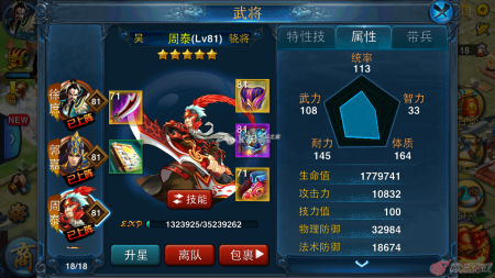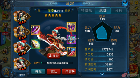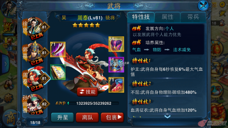 就拿上图的周泰来说吧,他特技一看就是一个肉盾,但是你看在目前的情况下来说,攻击1万也并不是很低,你完全可以给他穿上物理攻击装备来做半血半攻型武将,当然比起正统的半血半攻型骁将来说周泰的攻击并没有他们高,不过周泰的血量比较高,这又是一种弥补。