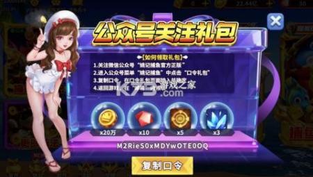 苹果手机:复制口令(比如M2RieS0xMDYwOTE0OQ),关注微信公众号“姚记捕鱼官方正版”,进入公众号菜单“姚记捕鱼”中点击“口令礼包”,复制口令,在口令礼包页面输入并确定,返回游戏,在“邮箱”内领取。