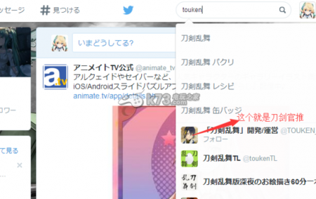 在推特的搜索栏输入 touken 第一个就是刀剑官推 点进去就能看到推文了