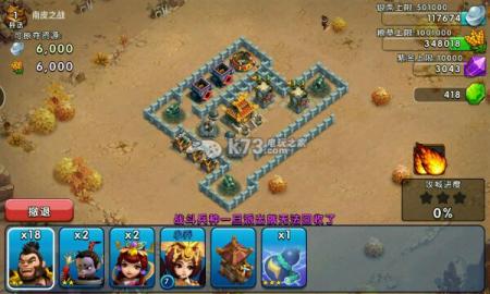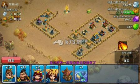 进攻方案:<本关卡有两个区域,本文称为大小战场>13个巨力校尉从大战场的六点钟方向(投石车)进去,搭配两个鼓乐师。武将带领30个步兵从小战场的六点钟方向进去入。
