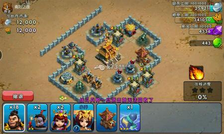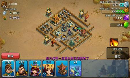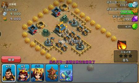 解析:由于南阳的防御建筑过多,环环相扣。所以不要优先选择投石车进行摧毁。眼光要放长远一点。先破掉五点钟方向的破空火箭。用巨力校尉搭配两个鼓乐师的阵容就可以进行一番屠杀了。