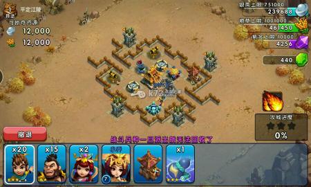 进攻方案:直接在五点钟方向(两个箭塔)放下所有的巨力校尉,兵站里面的兵到了就用闪电丹电死。破掉一个箭塔后,由于是三级墙,所以放下两个火药死士,接着武将进场。破掉两个破空火箭后,放下鼓乐师。这时候就可以放下手机,看着巨力校尉搭配两个鼓乐师的阵容慢慢推了。