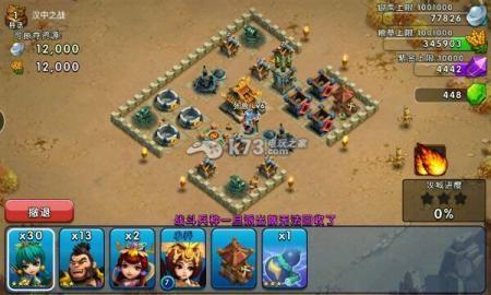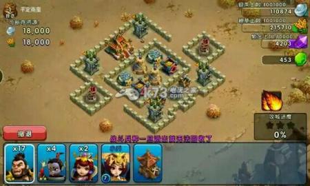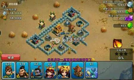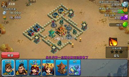 解析:由于没有破空火箭,且四点钟方向的箭塔等级较高,先破掉。火药死士破墙。巨力校尉搭配两个鼓乐师的阵容在内部可以一往无前。武将带领20步兵突袭后方箭塔,分担输出的同时,把输出做到最大化,加快防御建筑摧毁的进度。小伙伴们就可以进驻成都了。