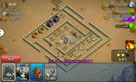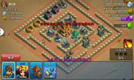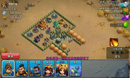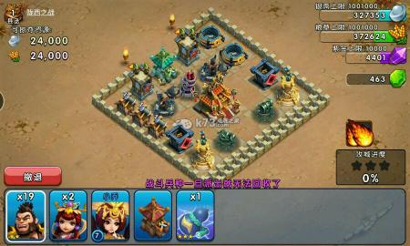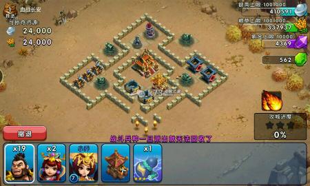 进攻方案:武将带领所有巨力校尉从十点钟方向(缺口)进场。用闪电丹电死兵站里面的驻防兵,同时也能攻击到防御建筑。待破空火箭摧毁后,两个鼓乐师进场。陇西之战可过。