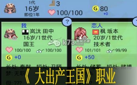 自己的王国多遇到主妇(+10幸福),草の王国是植物学者(研究药)和农夫(在草地跑得快,可赚钱),风是技术者(生产炸弹),地是鋐员(在山地跑得快,可赚钱),海是渔师(在水里跑得快,可赚钱),皇帝是科学者(研究炸弹)和教师(同家庭教师,小孩每年+1智力)和医师(生产药)和技术者。房子和宠物会提高求婚成功率。