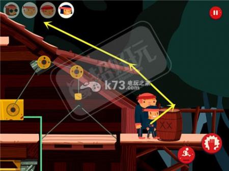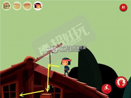接下来如图所示,当小女孩通过木桶爬到楼顶,再从上面下来。