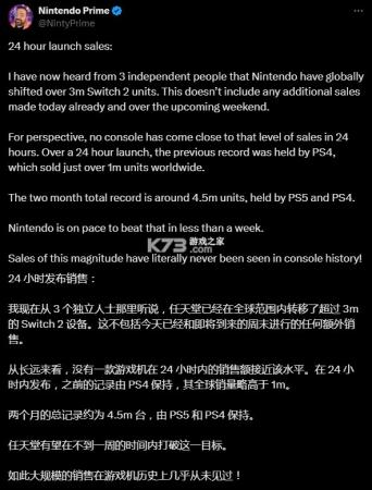 之前的主机首发销量冠军是由索尼的PS4和PS5主机夺得,其两个月的总销量为450万台。如果switch2真在一天内就达到了300万台的全球销量,那么其首月和前两个月的总销量将是非常恐怖的。