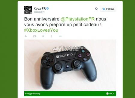 Xbox法国区的Twitter账户在这一天先是发表推文祝贺了PS4上市一周年,但微软还为PS4以及PS4的玩家们送上了一份“大礼”——微软专门定制的DualShock 4手柄。当然,微软“送礼”的同时还不忘促销自家的Xbox One,微软在DualShock 4手柄的触控板上印上“Xbox Love You”的字样,这或许才是微软祝贺PS4欧洲上市一周年的本意吧。
