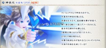 史雷与米库里欧神依化之后变化成水属性的神依形态。其武器是巨大的弓,擅长远距离攻击,能一次对一排敌人造成杀伤。 攻击以密集的连续攻击为主要形式,在3次连携攻击后弓会变得更大,将更多的敌人卷入其中。 |