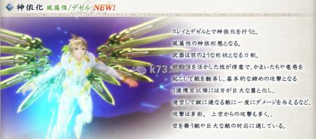 史雷与特泽尔神依化之后变化成风属性的神依形态,武器是化作羽翼状的刀剑。能高效地利用其机动性,对敌人发起大气攻击或龙卷,形成连携攻击。 达成3连击以上后背后的刀刃会化成巨大的翅膀,划过一连串的敌人造成一定伤害,攻击形式十分多彩。由于大多是从空中发起的攻击,适用于空中的敌人或体型巨大的敌人。 |